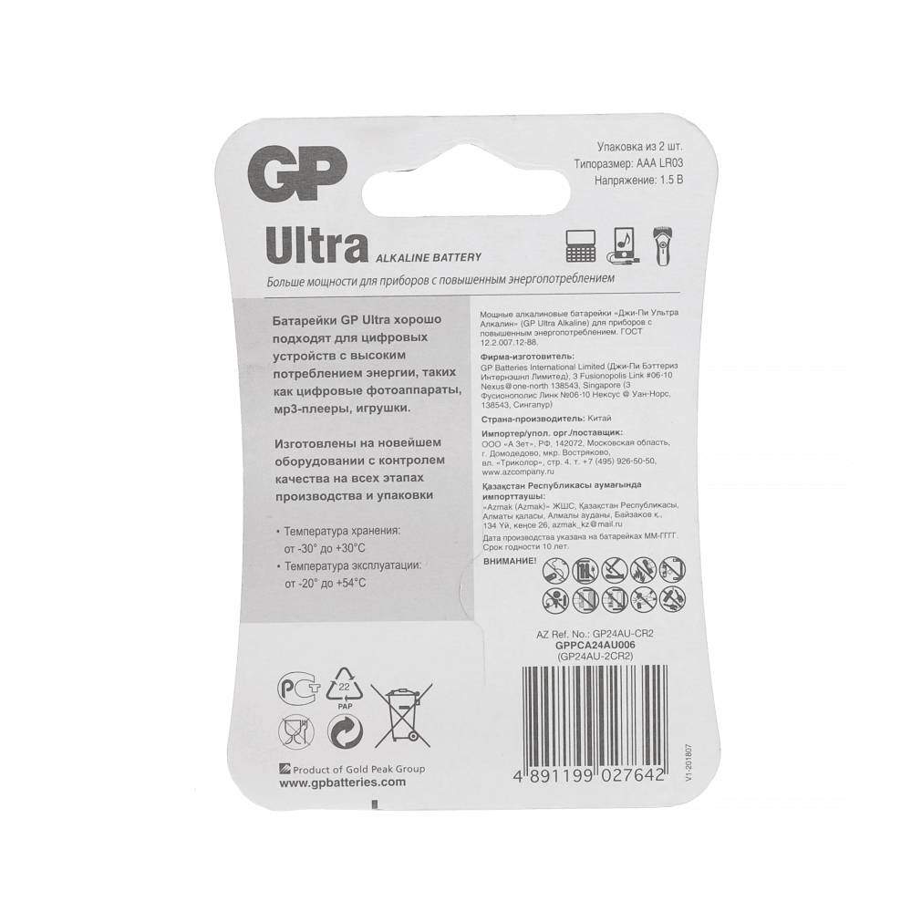 Умный гаджет GP Алкалиновые батарейки Ultra Alkaline 24А AАA - 2 шт. на блистере 24AU-CR2 Ultra 20/160 (GP 24AU-CR2 Ultra 20/160)