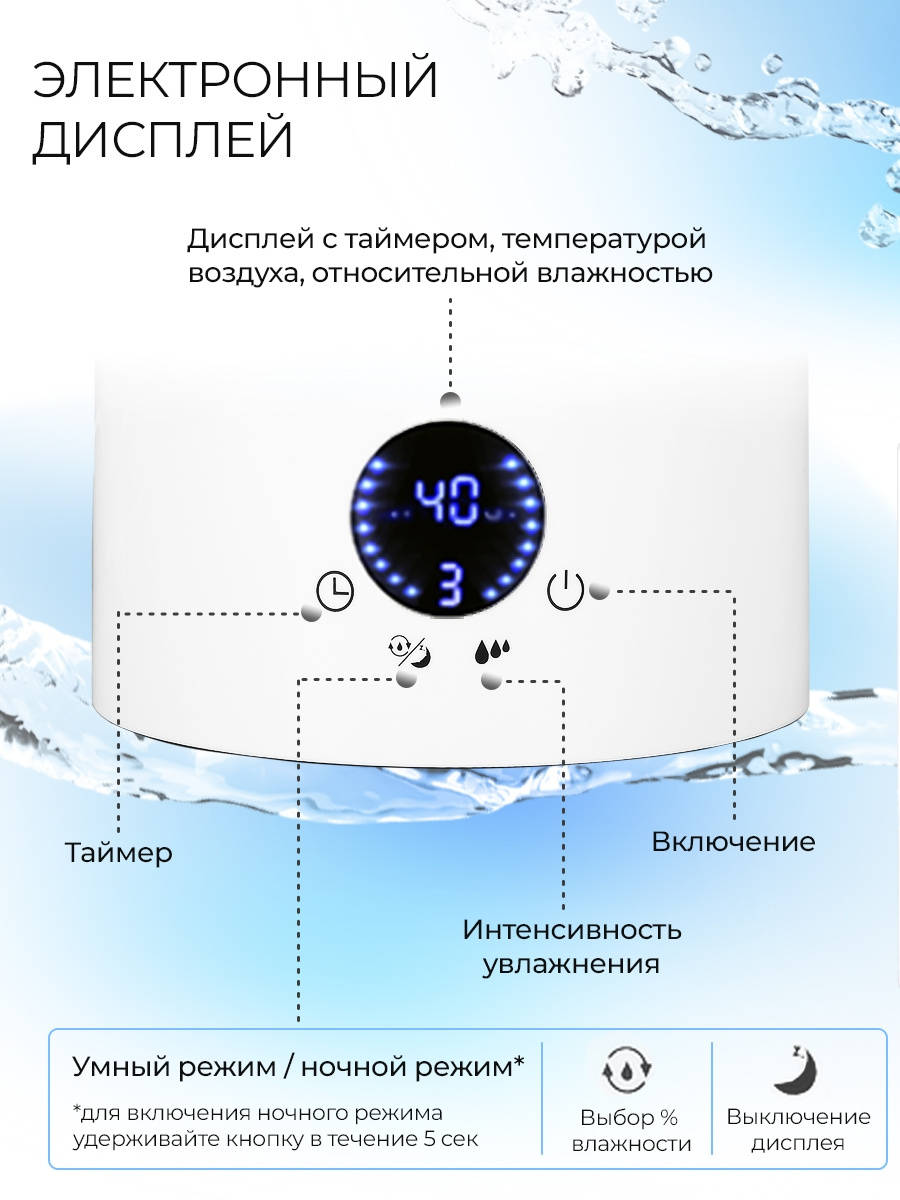 | Особенности: | Можно добавлять в воду ароматические вещества, специально предназначенные для ароматизации воздуха. |