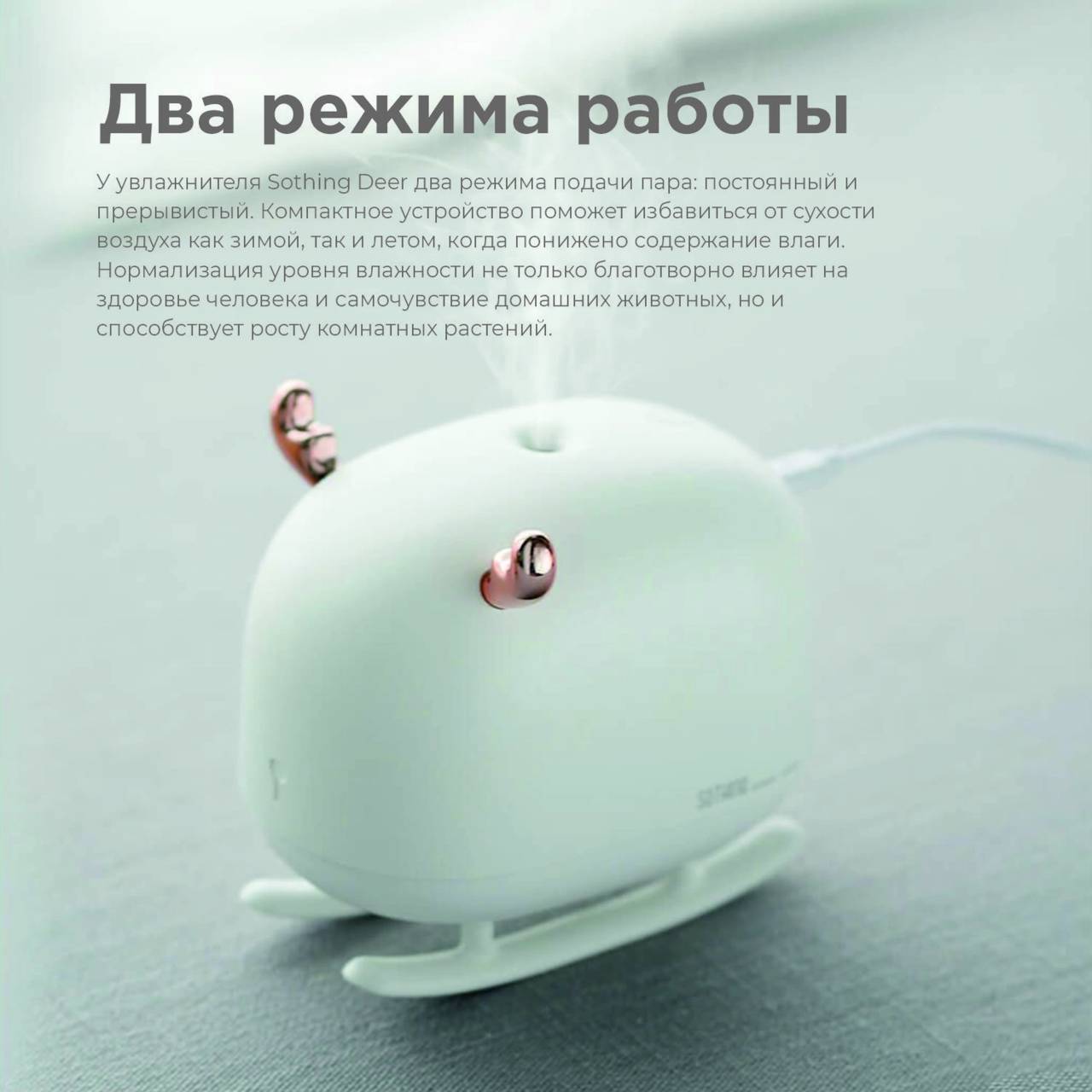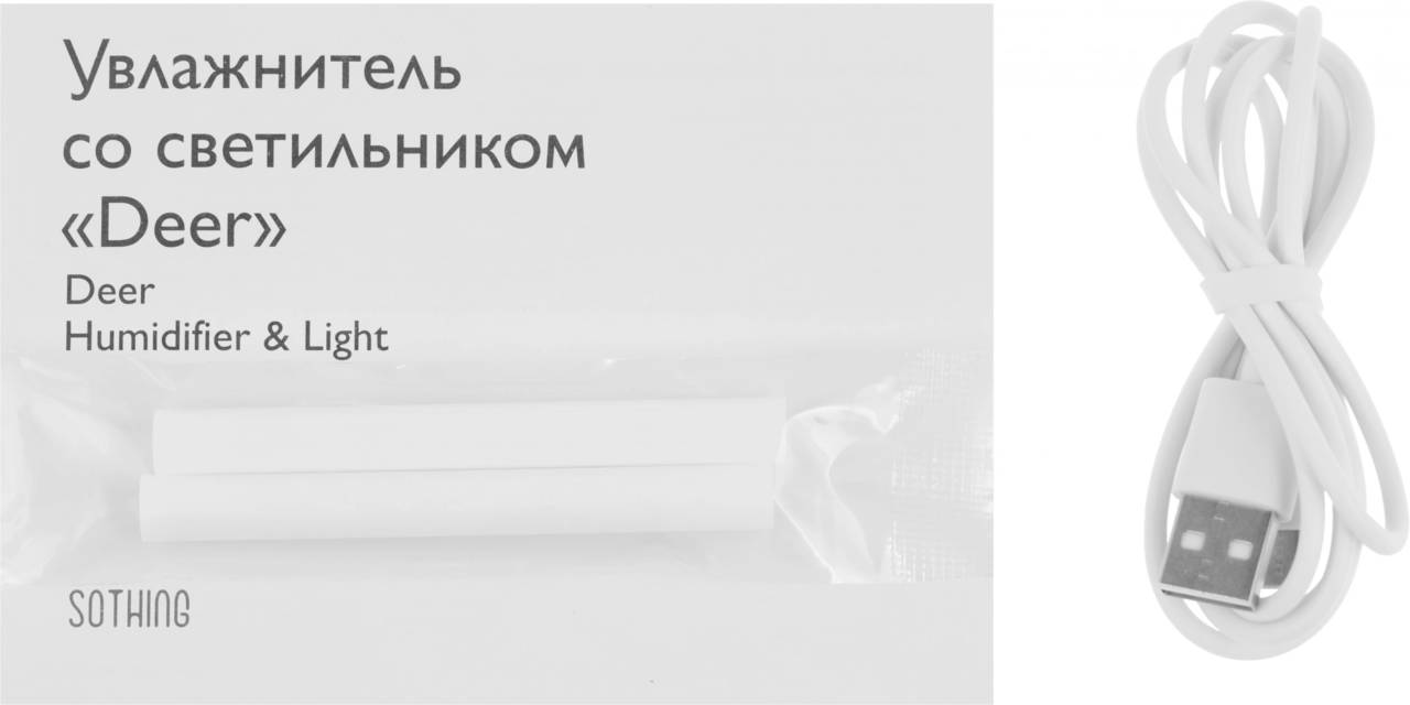 | Особенности: | Увлажнитель работает через USB кабель от адаптера питания (адаптер питания приобретается отдельно). Перед тем как наполнить воздух влагой, увлажнитель очищает воду от загрязнений с помощью специального фильтра, который встроен в трубку испарителя. Sothing Deer обладает функцией подсветки. |