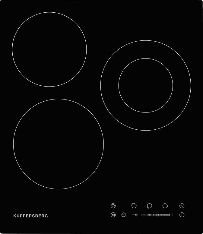 Варочная поверхность Kuppersberg Электричекая независимая стеклокерамическая варочная поверхность, ширина 45 см, 3 зоны ускоренного нагрева HI-Light, 1 зона с двойным расширением, сенсорное управление+слайдер, 4 цифровых дисплея, 9 уровней мощности, автоотключение, защита от перелива, защита от детей, индикаторы остаточного тепла, таймер, Stop & Go, цвет черный/прямой край (ECS 402)
